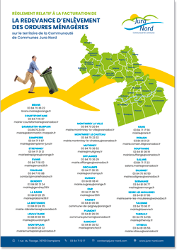 - Toutes les personnes vivant dans une des 32 communes de la Communauté de Communes Jura Nord, qu’elles soient propriétaires ou locataires d’une résidence principale ou secondaire, règlent une redevance qui finance le service public de collecte des déchets.