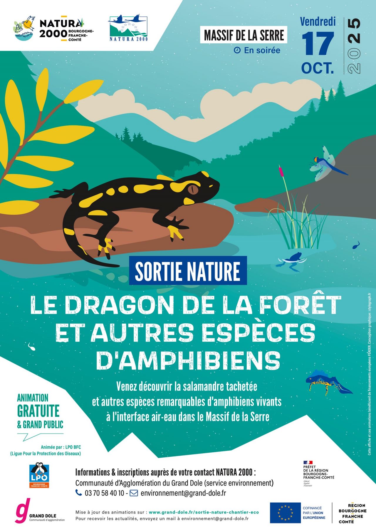 La Communauté d’Agglomération du Grand Dole vous invite à la dernière sortie du programme des animations Natura 2000 de l’année. En partenariat avec la Ligue de Protection des Oiseaux de Bourgogne-Franche-Comté, une sortie nature vous est proposée afin de découvrir et tenter d’observer la salamandre tâchetée et autres amphibiens que le site Natura 2000 du Massif de la Serre accueille.