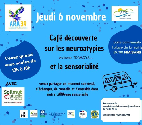 L’Association Relai Autisme ARA39 vous invite à un moment convivial, d’échanges, de partage et de conseils autour de l’autisme, du TDAH, des troubles DYS et de la sensorialité.