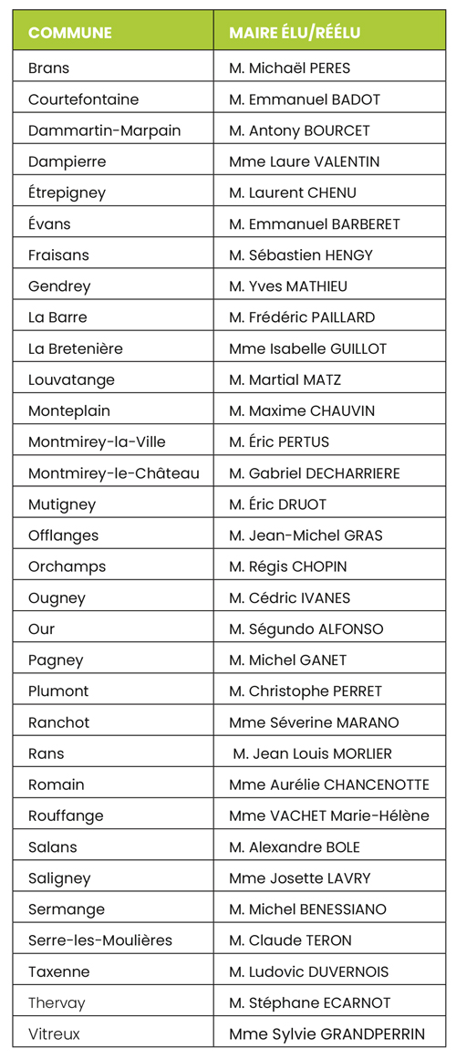 Les équipes municipales renouvelées ou reconduites incarnent un engagement fort au service de la proximité, de l’économie locale, de la culture et de l’environnement. Elles seront des partenaires précieux pour porter les projets communautaires communs, tels que l’enfance et la jeunesse, la gestion de l’eau, le développement économique et touristique et l’animation culturelle.