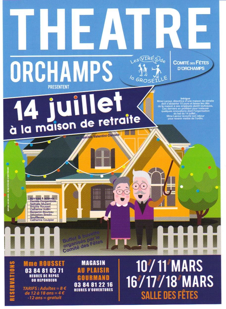 La troupe théâtrale du Comité des fêtes d’Orchamps, Les Virés de la Groseille, prépare sa nouvelle pièce de théâtre, « 14 juillet à la maison de retraite ». Ecrite par Pascale Valentini-Daniel, cette comédie emmènera les spectateurs dans les coulisses d’une maison de retraite et de ses employés plutôt loufoques. Mme Lacour, directrice de cet établissement, doit s’absenter dix jours et laisse les clés de la maison à ses employés. Ces derniers en profiteront pour instaurer quelques innovations, dont l’organisation d’un bal du 14 juillet… Mme Lacour écourte son séjour pour revenir mettre de l’ordre.