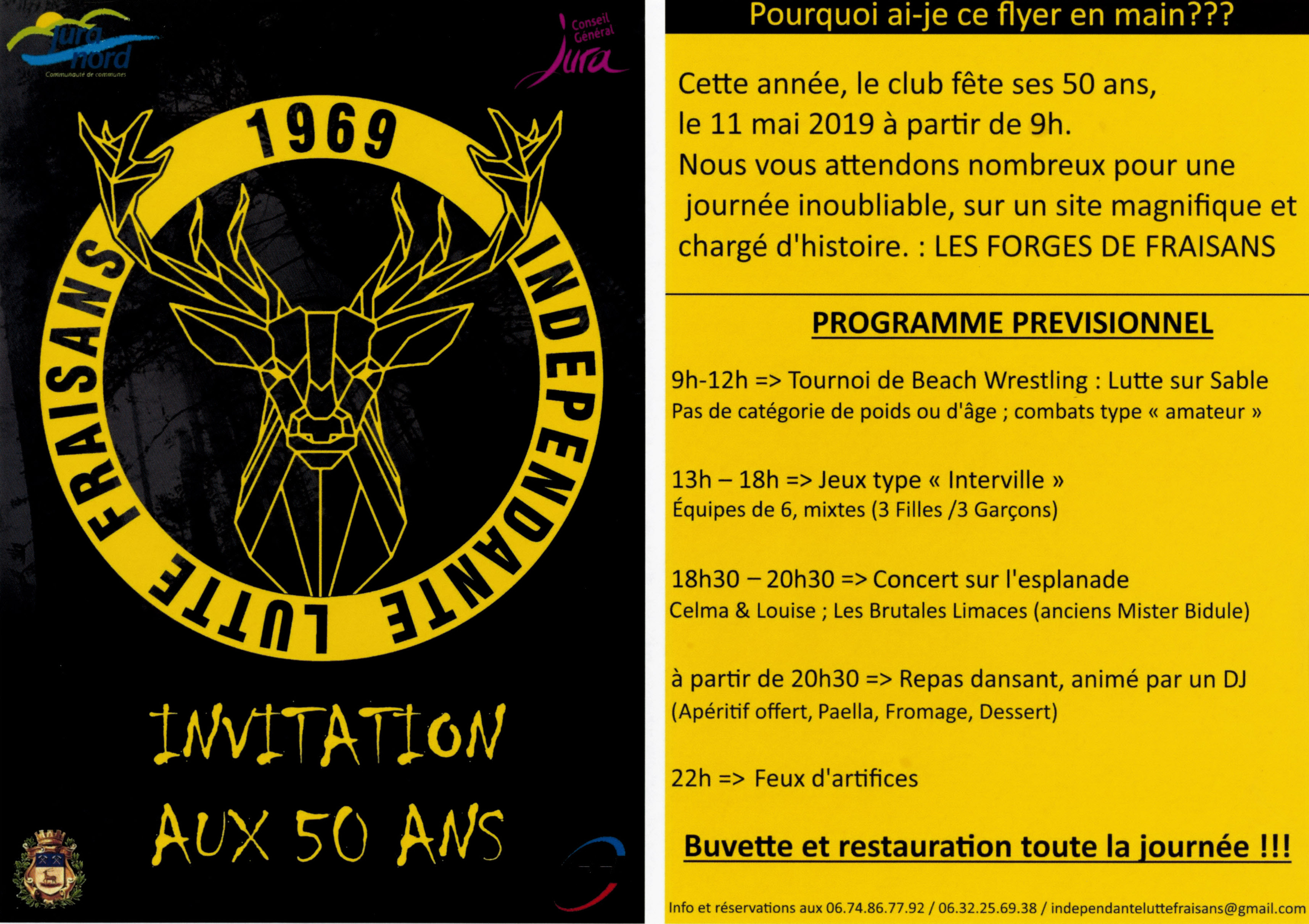 Pour cet anniversaire pas comme les autres, le club a vu les choses en grand avec l’organisation d’un tournoi de « beach-wrestling », de la lutte sur sable. Les combats seront amateurs et ouverts à toutes les catégories de poids ou d’âge. S’en suivront des jeux par équipe de type « Intervilles », un concert sur l’esplanade des Forges de Fraisans (Celma & Louise, Les Brutales Limaces), puis un repas dansant animé par un DJ (réservation obligatoire).