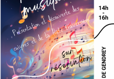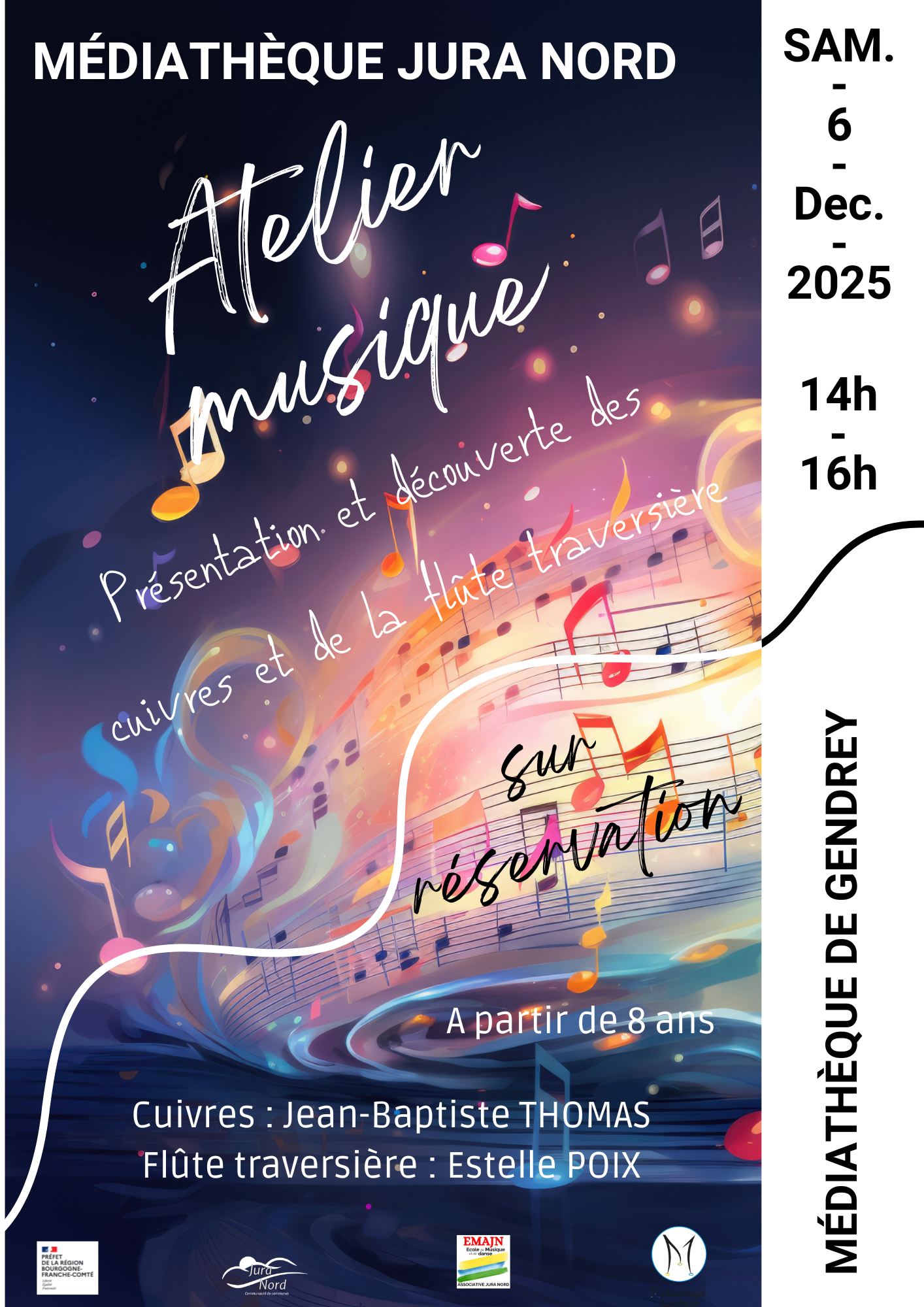 Venez retrouver Jean-Baptiste Thomas et Estelle Poix, professeurs de cuivres et de flûte traversière à l'Ecole de Musique et de Danse Associative Jura Nord. Ils nous proposeront un temps de partage et de découverte de leurs instruments.