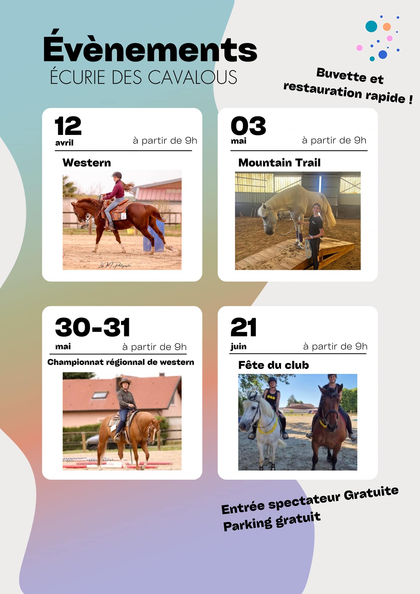 Buvette et restauration rapide. Entrée spectateurs gratuite. Facebook : centre des Cavalous
