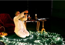 Dans la chaleur des guirlandes de Noël, une conteuse… et des mandarines. Manipulées, plumées, roulées ou mangées, elles incarnent des personnages, deviennent poupées, soleil ou bien encore fusée de l’espace.