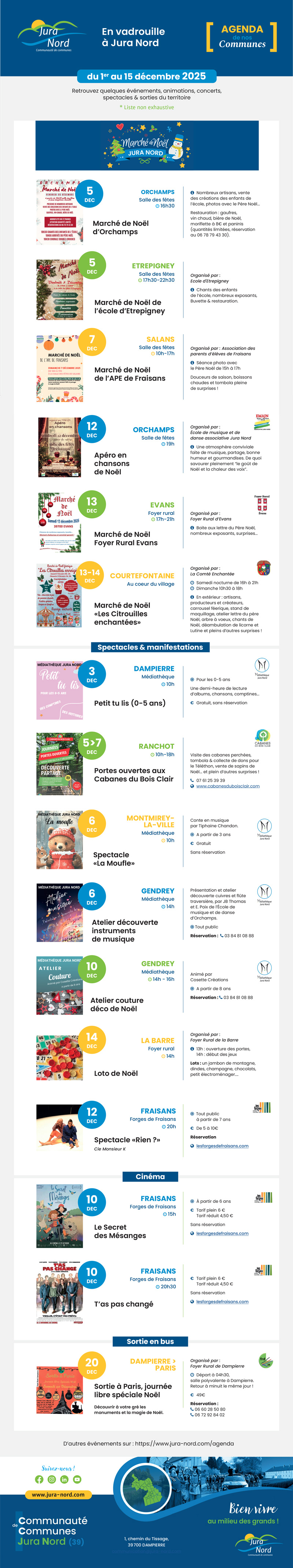 Retrouvez quelques événements, marchés de noël, animations, concerts, spectacles & sorties du territoire.