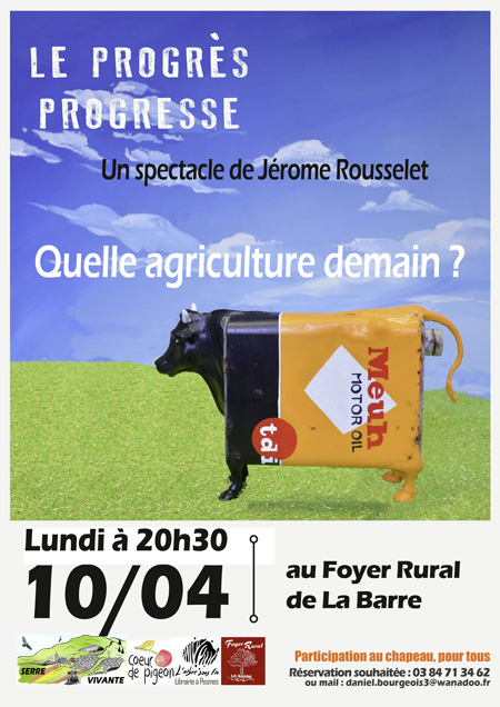 Le Foyer Rural de La Barre accueille dans ses murs le spectacle "Le progrès progresse" de Jérome Rousselet, paysan devenu comédien.