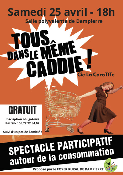 Achat compulsif, achat malin, achat gagnant. .. Jouons dans le labyrinthe de la consommation et naviguons de saynètes en sketches d'improvisation. Original dans sa forme, "Tous dans le même Caddie" est un spectacle de la Cie La Carotte qui retrace, en trois saynètes humoristiques, la vie de "X Sel" et de ses habitudes alimentaires. Ces saynètes laissent place à des moments de convivialité destinés aux dégustations et à des échanges.