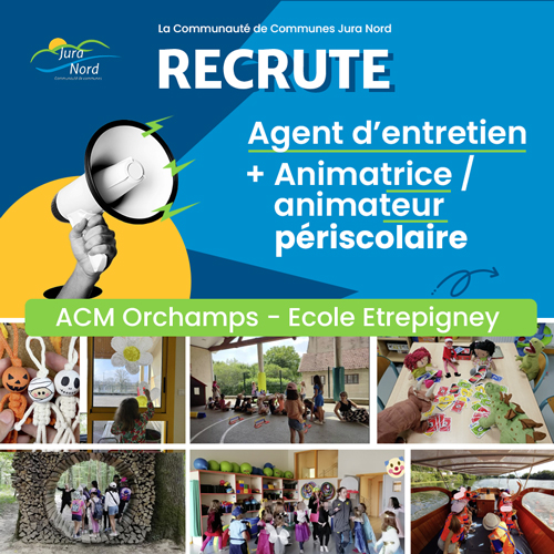 ACM de ORCHAMPSAgent d'entretien + Animatrice/animateur périscolaire ECandidatures possibles jusqu’au 29/03/2026. Sous l’autorité du responsable de site, l’agent contribue à l’entretien, et au nettoyage des classes à l’école d’Etrepigney, ainsi qu’a l’entretien pendant les vacances (grand ménage), afin de garantir un environnement propre, sain et accueillant pour les enfants et l’équipe éducative. Il participe également à l’accueil, à l’encadrement et à l’animation des enfants aux ACM d’ORCHAMPS dans le cadre des activités périscolaires midi et soir. Profil recherché