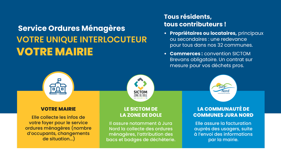 - LE SICTOM DE LA ZONE DE DOLE : assure notamment à Jura Nord la collecte des ordures ménagères, l’attribution des bacs et des badges de déchetterie. Plus d’infos : www.sictomdole.fr